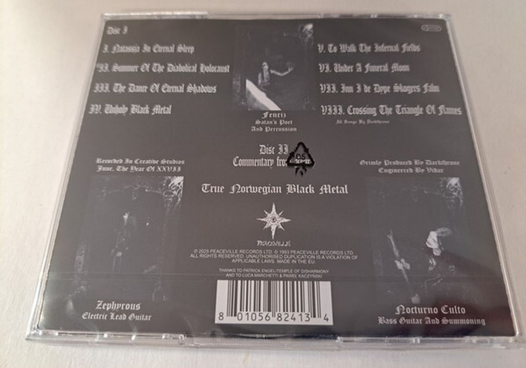 On hype sticker on the front: "Unholy Black Metal Anniversary Series - II; Under A Funeral Moon; Double Disc Edition; 30th Anniversary Restored Master; Plus bonus disc with commentary from Fenriz; Peaceville; CDVILED1241X"